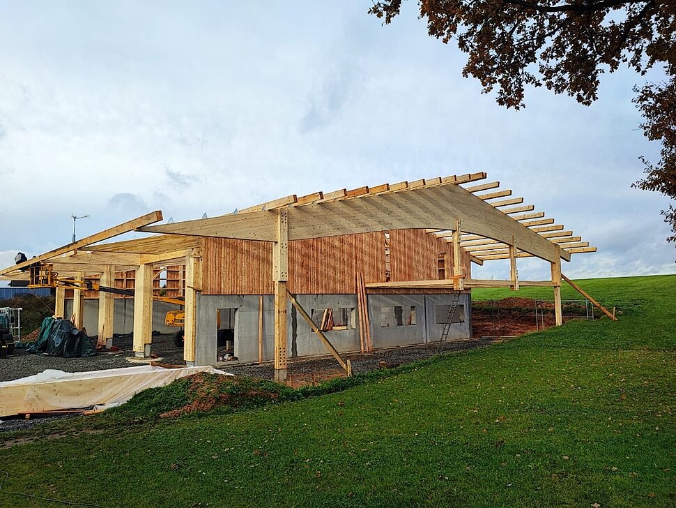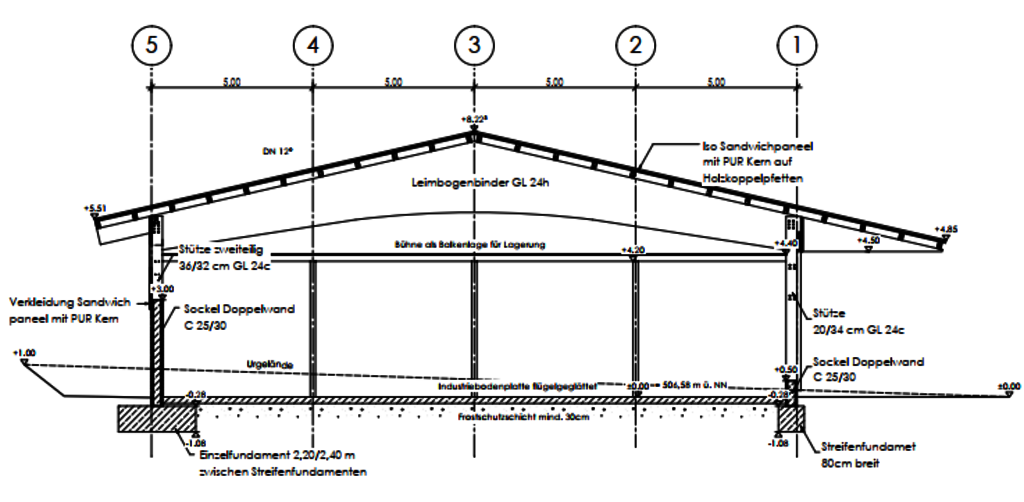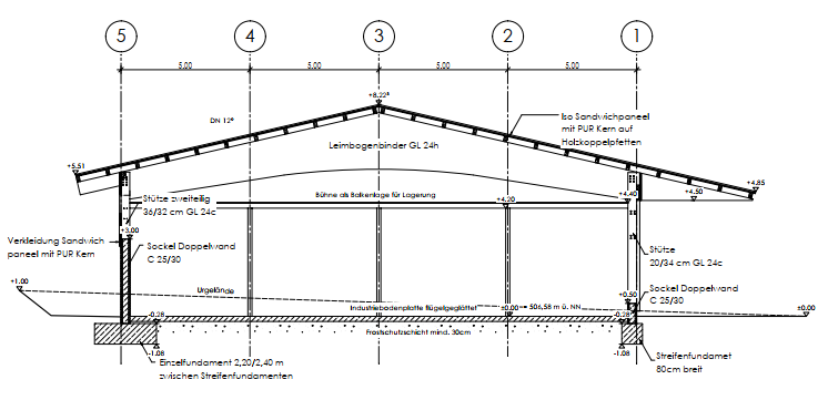 - Holzleimbinder: Die Verwendung von Holzleimbindern als Bogenbinder für die Dachkonstruktion ermöglicht eine große freitragende Spannweite von ca. 20 Metern. Dies bietet nicht nur eine ästhetisch ansprechende Optik, sondern maximiert auch die nutzbare Fläche unter dem Dach ohne störende Stützen.