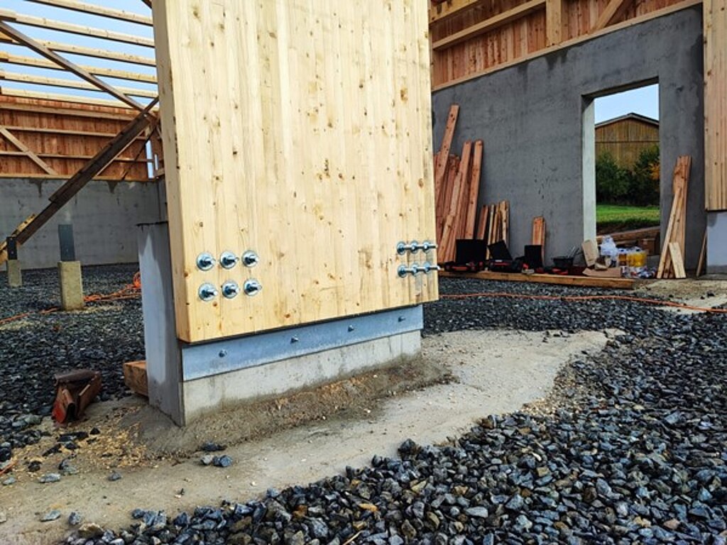- Holzingenieurbaukonstruktion mit einseitig eingespannten Holzstützen auf Stahlbetonwänden