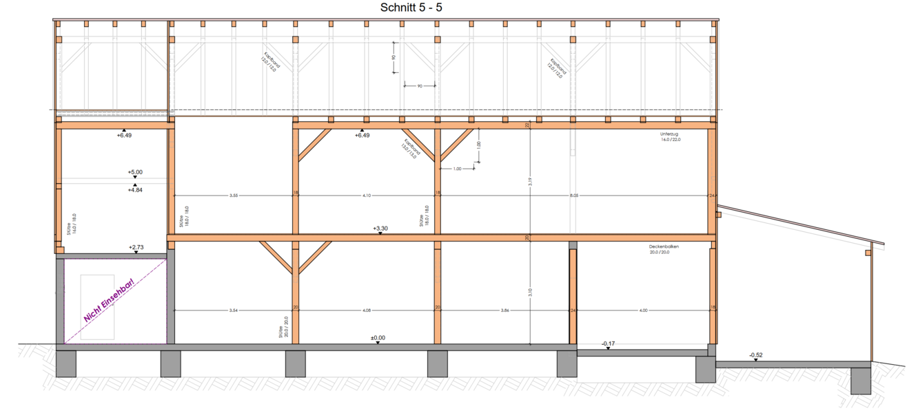 - Lage im Ortskern: Die Lage im Ortskern bedingt viele planungstechnische Schwierigkeiten im Hinblick auf unmittelbar angrenzende Wohnbebauungen. Es sind im Rahmen des Schall- und Brandschutzes kreative Planungslösungen zu erarbeiten, die umliegende Bebauungen schützen und gleichzeitig im Praxisbetrieb handhabbar sind.