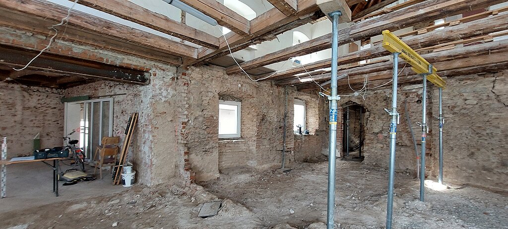 - Entkernung/Rückbau: Viele bautechnischen Anforderungen an moderne Wohngebäude bedingen erhebliche Eingriffe in die vorhandene Bausubstanz, z. B. aus Gründen des Schall- oder Brandschutzes. In Teilen wurden die vorhandenen Deckenaufbauten bis auf die Rohbalkenlagen zurückgebaut und neu wieder aufgebaut.
